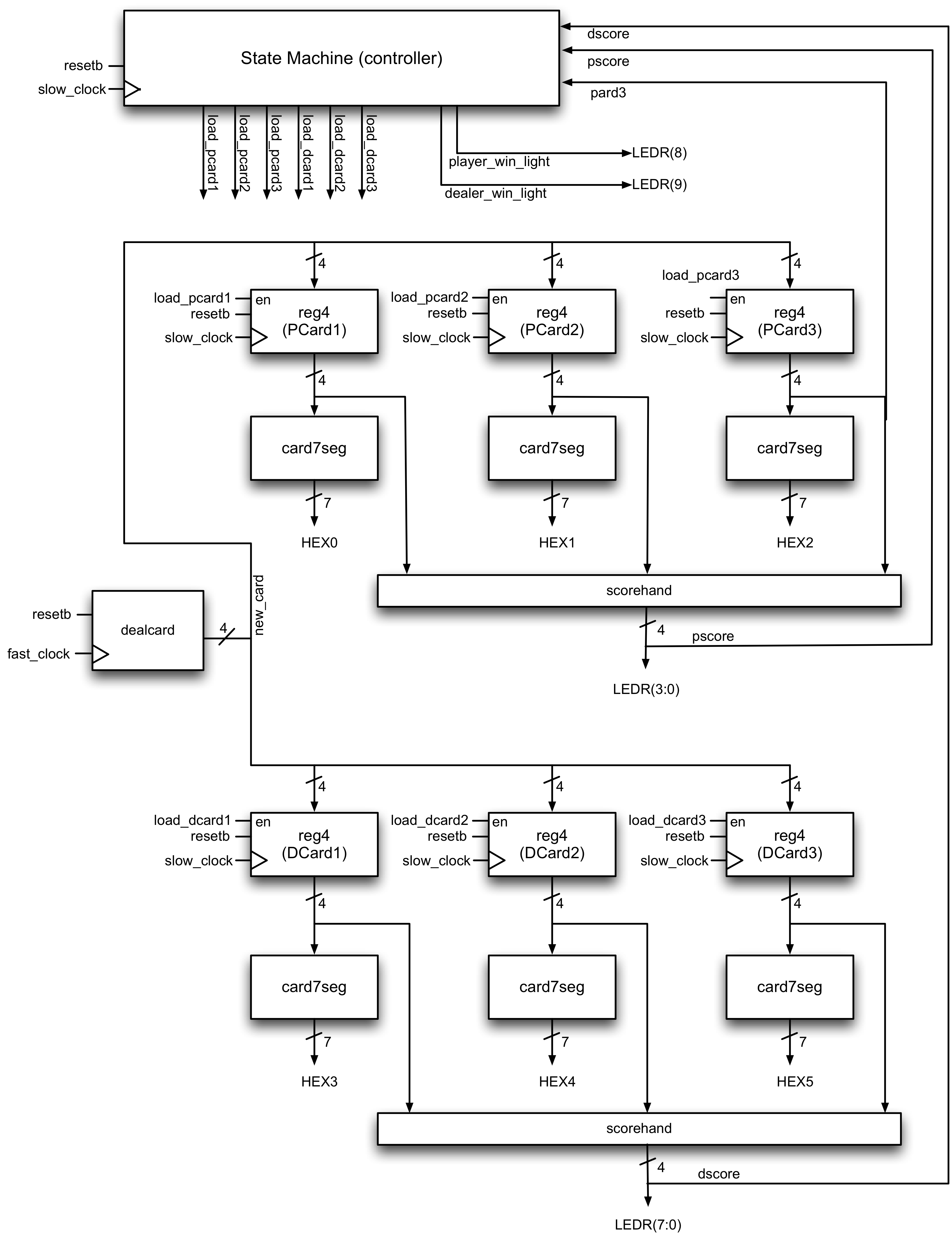 The game starts by asserting the reset signal (KEY3) which is active-low and synchronous. The user can then step through each step of the game (deal one card to the player, one to the dealer, etc) by pressing KEY0 (this will be referred as slow_clock in this document). The exact sequence of states will be described below. As the cards are dealt, the player’s hand is shown on HEX0 to HEX2 (one hex digit per card — remember each hand can contain up to three cards) and the dealer’s hand is shown on HEX3 to HEX5. The current score of the player’s hand will be shown on lights LEDR3 to LEDR0 (recall that the score of a hand is always in the range [0,9] and can be represented using four bits), and the current score of the dealer’s hand will be shown on LEDR7 to LEDR4. We use lights to display the binary version of the score, since the DE1-SoC only has six hex digits.