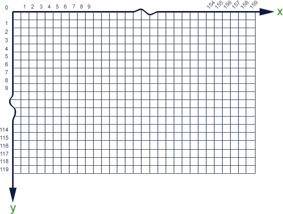 You can picture the VGA pixel grid as shown below. The (x,y) position (0,0) is located on the top-left corner and (159,119) is at the other extreme end. The pixel colours are stored in each cell. This grid is stored in on-chip memory, and is called a framebuffer.
